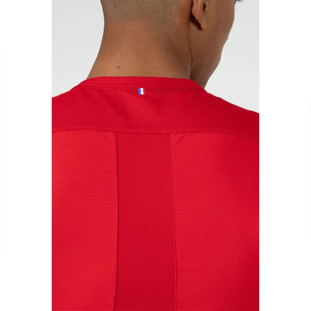 cotton/polyester/elastane jersey- Breathable coating, allows for optimal absorption of moisture released by the body (eliminating the risk of hyperthermia and hypothermia)- Comfortable, stretchy and soft to wear- Slim fit- Athletic cut back that hugs the body in Perf piqué jersey, and side and bottom insert in breathable ´´textured´´ polyester/elastane jersey, ´´Performance´´ printed braid at back neckline- New ´´Le Coq Logo´´ embroidered badge on the left breast- Woven and dyed