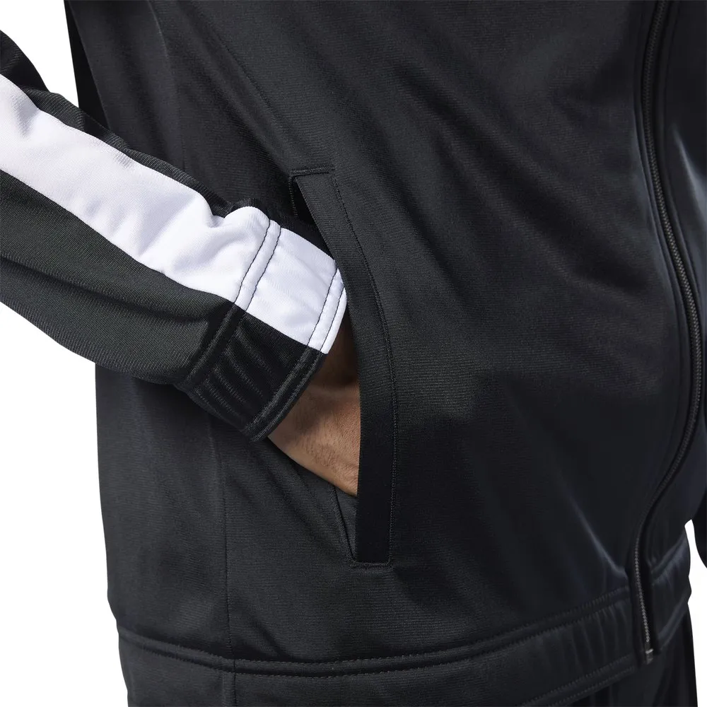 Pair this men´s jogging jacket with jeans or matching pants for a modern look. The sleek slim fit will make you look great. The Reebok logos on the legs affirm your brand loyalty.Close fit.Full zip and stand-up collar.Front pockets.
